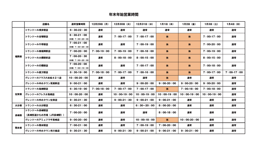 Newsお知らせ 2025.12.02年末年始営業時間のお知らせ 日頃よりご愛顧いただき、ありがとうございます。 年末年始の営業時間は以下の通りとなります。 新年も皆様のご来店を心よりお待ちしております。 <前のお知らせ お知らせ一覧